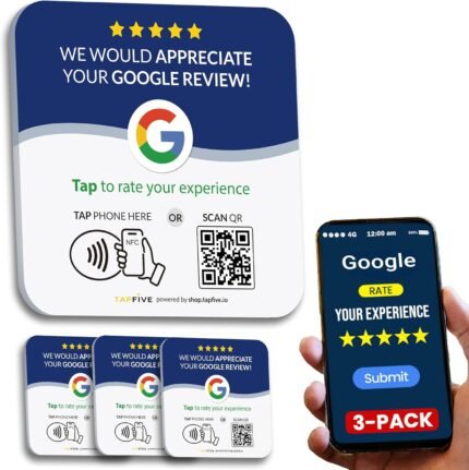 Tap Google Review Plate (3-Pack) by TapFive – Tap for Instant Reviews – All Phones Compatible – Reusable Smart Tap NFC & QR – 4″x 4″ – DigiFeel & Zappy Fast – Mount Anywhere 3M Adhesive (3 Plates)