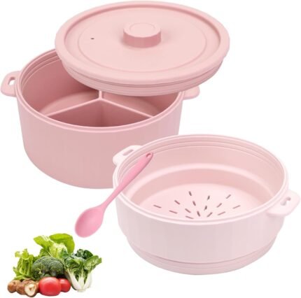 BestYiJo Microwave Rice Cooker, 2-Layer Microwave Pasta Cooker and Steamer for Rice, Vegetables, Quinoa, Oatmeal, Ramen –Silicone Non-Stick(PINK)