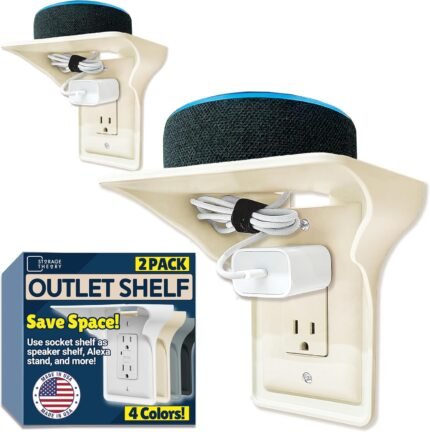 BeraTek Power Perch Wall Outlet Shelf | Declutter & Reclaim Counter Space | Bedroom & Bathroom Organizing Shelves | Alexa Echo Dot Holder, Router Shelf, Holds Electric Toothbrush | Almond, 2-Pack