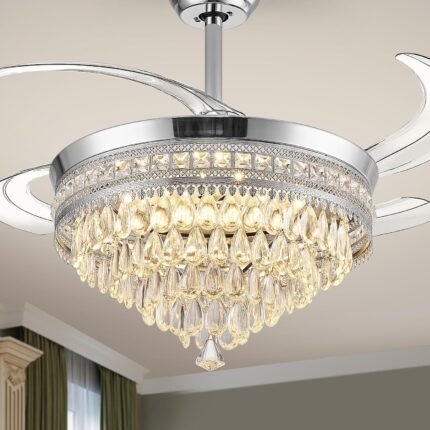 Chandelier Ceiling Fan with Lights and Remote,42 Inch Modern Flush Mount for Bedroom Indoor, Dimmable LED,Bluetooth Connection,Energy Efficient Quiet Retractable Blades (42 in White)