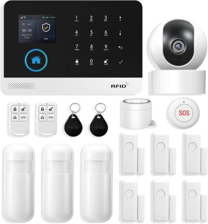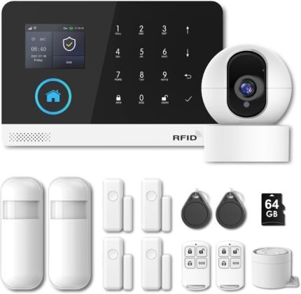 Home Alarm System with Camera, 23 Pieces Wireless WiFi/GSM SMS Home Security System with Motion Detector, 120dB Alarm Siren, Remote Control, Doorbell Button and SOS Button for Villa,Warehouse