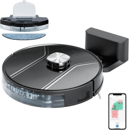 Price: (as of – Details) Transform your cleaning routine with this sleek black robotic vacuum cleaner. Featuring advanced navigation technology