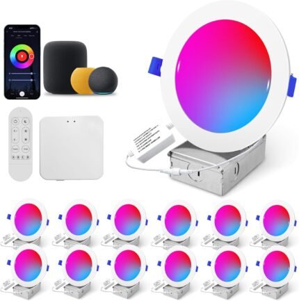 Wi-Fi & Bluetooth Smart Recessed Lighting 6 Inch RGB Downlight Can Lights – 13W 1100LM 93CRI, Ceiling Light with Signal-Boosting Mesh Gateway, Alexa/Google/Siri & Remote/App/Switch Control, 12 Pack