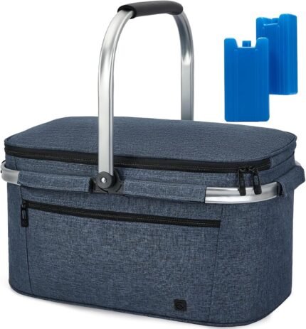 ALLCAMP Picnic Basket – 2 Ice Box Included 32L Insulated Cooler, Thickening Foldable Picnic Basket with Removable Baskets & Sewn-in Frame, Basket for House Warming Gifts New Home(Blue)