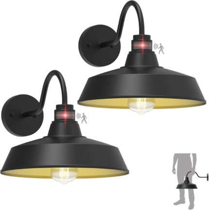 14.5″ Dome Gooseneck Barn Light, Outdoor Anti-Rust&Waterproof Farmhouse Wall Sconce, Outdoor Wall Lanterns for Porch/Patio, E26 Base 100W Max(Black 2-Pack Motion Sensor Outdoor Lights)