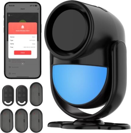 WiFi PIR Motion Detector Alarm with 4 Door Sensors and 2 Remote, Home Alarm System with Phone APP Alert for Home Ranch Van Carport Shop120db Extra Loud-Black
