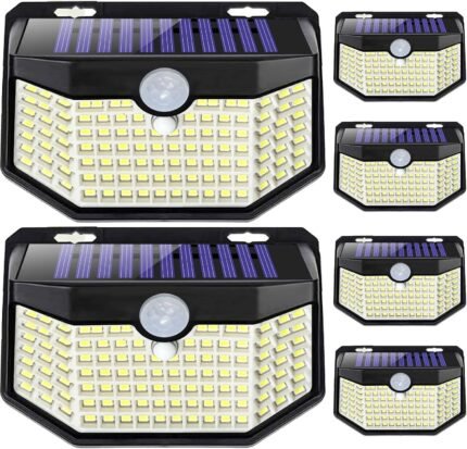 HMCITY 120 LED Outdoor Solar Lights with Motion Sensor and 3 Lighting Modes, IP65 Waterproof Wide Solar Wall Lights Ideal for Garden Patio Yard (Front Button 6Packs, Daylight White, 6500K)