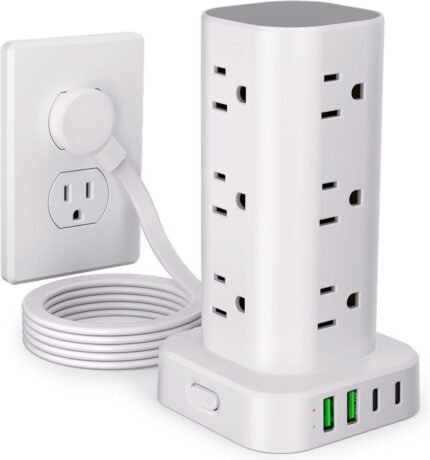 Price: (as of – Details) Product description Surge Protector Power Strip Tower with Wireless Charger,17-in-1 6FT Flat Plug Extension Cord,12