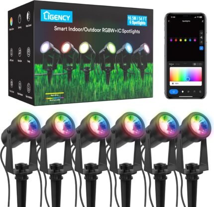 Ligency Outdoor Spotlight Smart Landscape Lighting, 6 Pack Low Voltage Outdoor Spot Lights IP65 Waterproof Work with Alexa and Google Assistant, RGBW Color Changing Spotlights for Yard, 54Ft