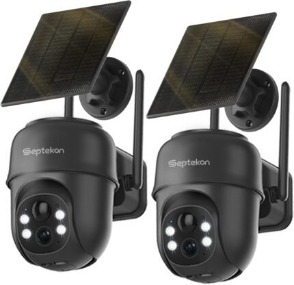 Septekon 2K Solar Security Cameras Wireless Outdoor 2 Pack, 360°PTZ Battery Powered Outdoor Camera, 2.4G WiFi Camera with Spotlight Color Night Vision, Motion Sensor Alarm, IP66, Black