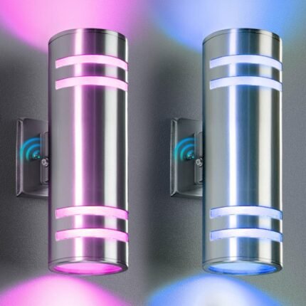 Smart Stainless Steel Outdoor Wall Light 2 Pack, WiFi RGB Up and Down Sconce with Dusk to Dawn Sensor, Color Changing Exterior Lighting Fixtures, Compatible with Alexa & Google, Remote Included