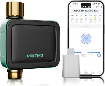 RESTMO Smart Sprinkler Timer with Flow Meter, Water Timer for Garden Hose, Brass Inlet & Outlet, Automatic Lawn & Yard Irrigation Watering System, APP Control (Bluetooth Connection, Not Include Hub)