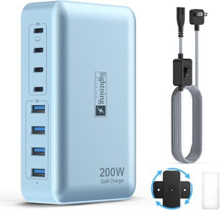 8-Port USB Charger Block 200W with Flat Plug, Braided Power Cord, and On/Off Switch- USB Charging Hub for iPhone, iPad, MacBook and More- 65W C Port Power Adapter for Laptops