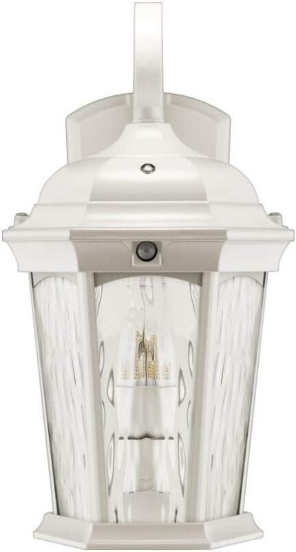 Euri Lighting EFL-140W-MD Flickering Flame Lantern, Water Glass, with Integrated Security Light (3000K), Photocell and Motion-Sensor (Dusk-to-Dawn), White Housing
