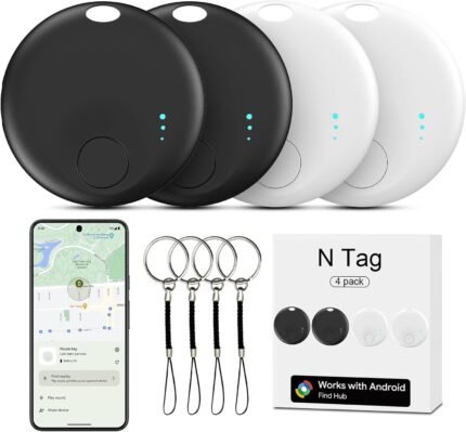 Smart Tags for Android Tracker Tags 4 Pack, Bluetooth Tracker Tag Work with Google’s Find Hub App, Android Luggage Tracker Tags, Key Finder Locator with Sound for Wallet, Bag, Suitcases(White&Black)