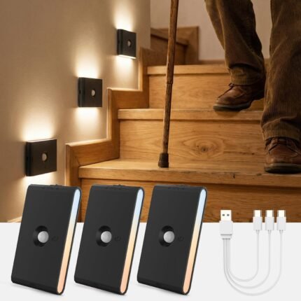 wowatt Rechargeable Motion Sensor Stair Light, Black Night Lights with Magnetic Mount, Dimmable Stair Lights Indoor for Stairway, Hallway, Kitchen, Bathroom(3 Packs)