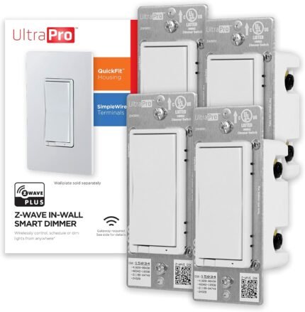 UltraPro Z-Wave Smart Light Dimmer with QuickFit & SimpleWire, 3-Way Ready, Works with Alexa, Google Assistant, ZWave Hub Required, Repeater/Range Extender, White Paddle, 4-Pack, Smart Switch, 54898