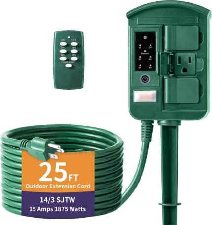 Outdoor Power Stake Timer for Christmas Light Decorations Waterproof, Dusk to Dawn, Outdoor Power Strip with 6 Outlets, 1875W/15A, 100FT Wireless Remote Control, 25FT Extension Cord, Heavy Duty