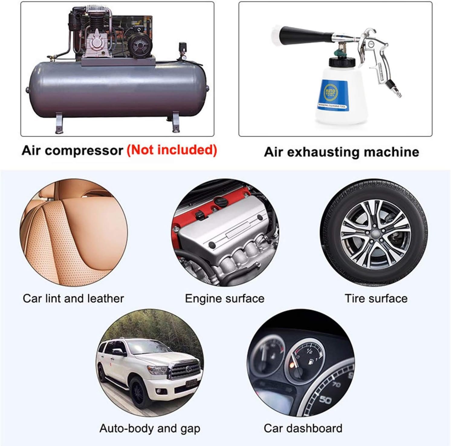 🧼【Wide Application】: Not only for car interior, but also for home cleaning: bicycle, motorbike, yard ground, swimming pool,beach chair, glass, wall, Blinds, screens, carpet,computer case,microwave oven, kitchen facilities and various kinds of fans,tractors, farming equipment and animal lodging,leather shoes, etc. Multi-functional car cleaning gun – YOU DESERVE IT!