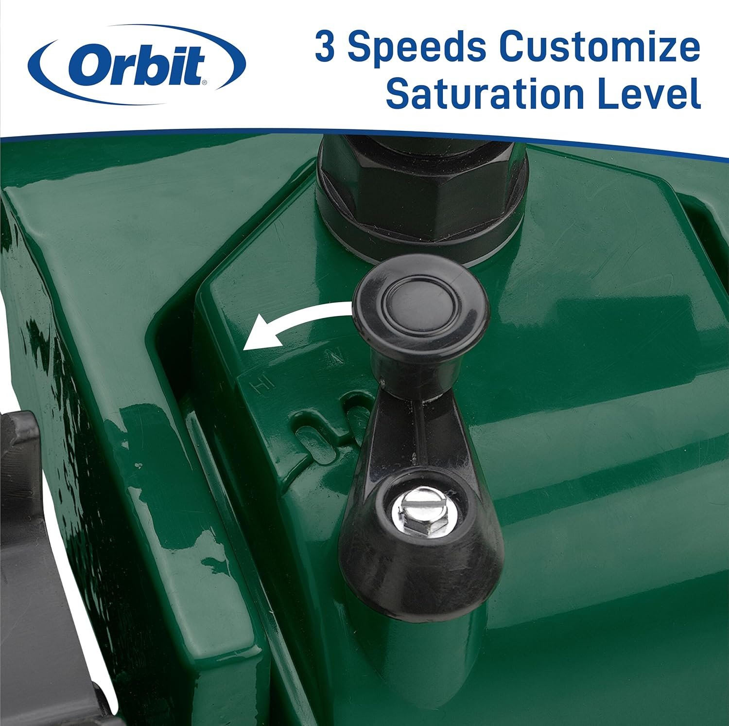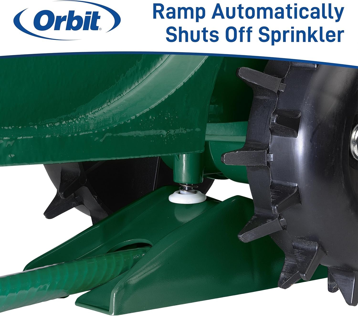 Introducing the innovative Orbit Traveling Sprinkler – the ultimate watering solution for your lawn. Let this self-propelled sprinkler do the moving for you and create a personalized watering system that covers every inch of your yard. Compatible with a 5/8-in. hose, this portable sprinkler can traverse up to 200 ft., ensuring comprehensive coverage for even the largest lawns. Crafted with a durable cast-iron body, this heavy-duty sprinkler guarantees smooth and reliable travel along the hose path without stalling. With spiked rear wheels and durable gears, it performs flawlessly on any terrain. The Orbit Traveling Sprinkler features a rotary spray system that delivers even coverage to your lawn. Twist each spray arm to adjust the watering diameter from 15 ft. to 55 ft., ensuring every corner of your lawn receives the perfect amount of water. With three speed settings, you have flexibility and control in your watering routine. Choose from high, low, or neutral speed control to achieve different rates of coverage that suit your lawn’s specific watering needs. Designed with convenience in mind, the Orbit Traveling Sprinkler includes a specialty ramp that allows you to stop at any location along the hose length and turn off the sprinkler. The shut-off plunger contacts the ramp stop, precisely stopping the sprinkler and giving you full control over your watering routine. No more manual moving or adjustments required. Orbit’s Traveling Sprinkler is not just a regular sprinkler – it’s a high-performance, technologically-advanced lawn care companion. Its durable construction, efficient water distribution, and traveling capability provide a reliable and comprehensive solution for your lawn watering needs. Transform your lawn maintenance experience with the Orbit Traveling Sprinkler and enjoy the convenience and peace of mind it brings to your gardening routine. Let your sprinkler do the work, so you can sit back and enjoy a perfectly watered lawn.