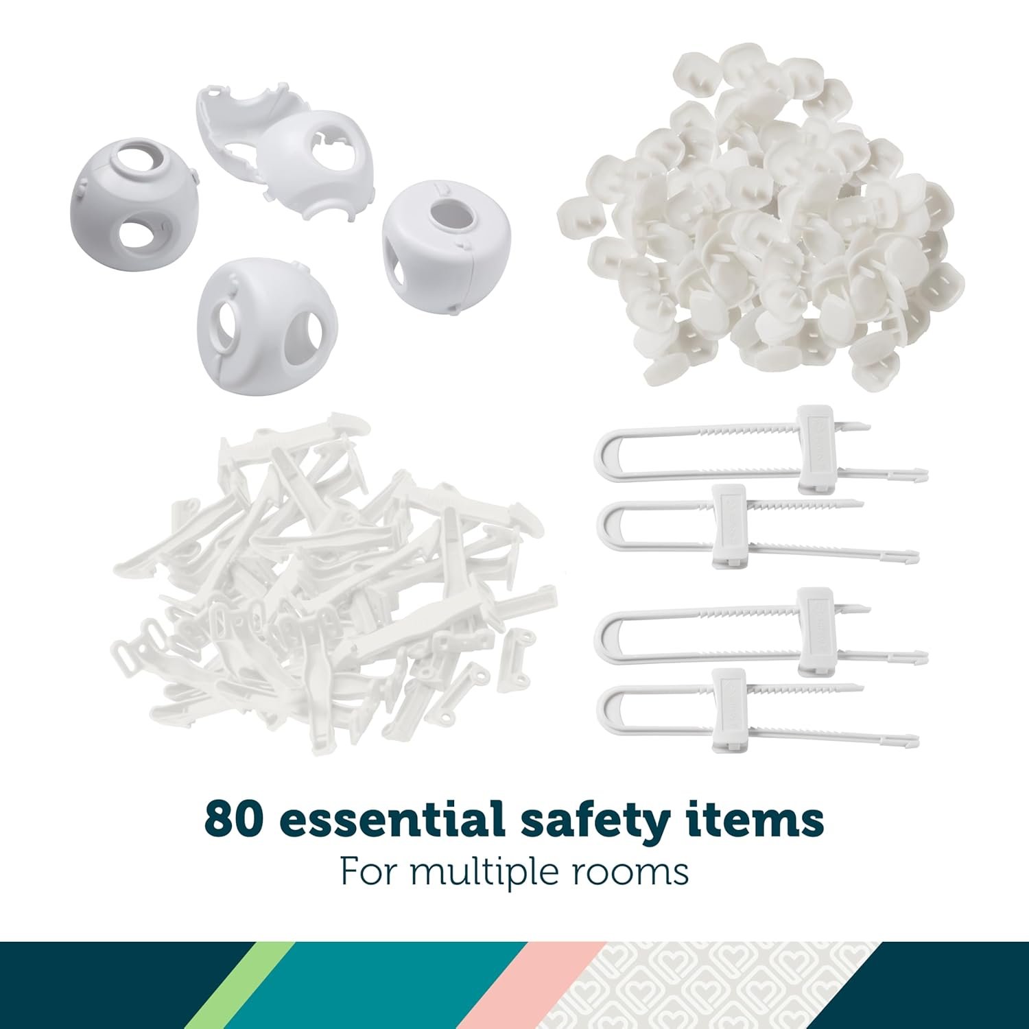The Home Safeguarding Set by Safety 1st makes it simple to include safety in your plans when preparing the nursery and other rooms of your home for your new baby. These 80 essential safety items will help you make things safer for your new bundle of joy. The set includes 40 plug protectors, 6 Grip ‘n Twist Door Knob covers, 30 Cabinet & Drawer Latches, and 4 Cabinet Slide Locks to help you secure multiple rooms in your home.Outlets are close to the floor and easy for curious children to reach. Installing Plug Protectors helps prevent young children from accessing unused outlets, with a smooth, non-grip design and opaque color that goes unnoticed by children.Some rooms need to be completely out of bounds to little explorers. Grip ‘n Twist Door Knob Covers allow parents easy access to the door knob, but stop young children from entering the room. The covers are easily assembled around your door knob; simply click the two halves together by aligning the interlocking tabs. To use, grab the door knob through the holes in the cover and turn.Cabinets contain cookies, snacks, and other food that children shouldn’t have easy access to. Install Latches on cabinets or drawers and use Cabinet Slide Locks on cabinets that are side by side. These devices help keep curious children from getting inside.Remember, safeguarding the home early will help make things easier for the whole family as your child grows. Begin by preparing the nursery before baby arrives; and the kitchen, bathroom, and other common areas before your baby starts crawling.