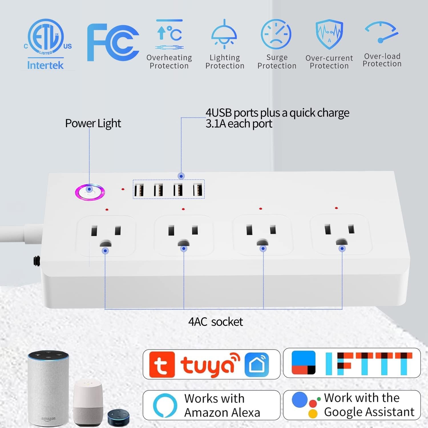 Compatible with Tuya Hub, Philips Hue.Voice ControlRemote ControlSurge ProtectionWorks with Alexa and Google HomeSet Schedules and Device ShareCompatible with Android and IOS