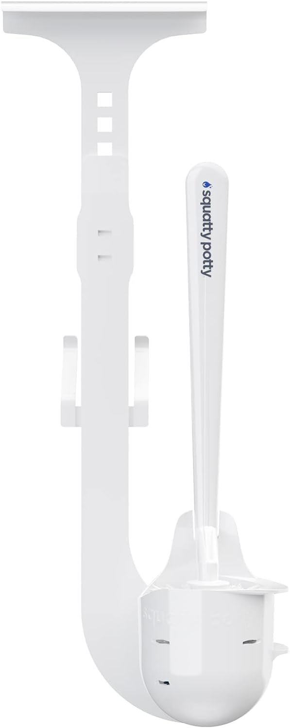 This bathroom essential hides behind your toilet instead of cluttering up your floor. Great for small bathrooms, RVs, guest baths, and for anyone who likes to keep things tidy. Squatty Potty Invisibrush allows you to hang the toilet brush behind your toilet tank when not in use. The caddy quickly snaps onto an extender, which hangs off the toilet tank. Change the length of the adjustable extender to raise or lower the caddy to suit your toilet or your preference. Ready to clean the toilet? Tilt the handle to the side and pull out the brush. With all the pooping you will generate by using the Squatty Potty, you’ll want one of these handy brushes available when it’s time to clean. Dimensions: 4″D × 5.75″W × 15″H Hanger needs 1/2″ of space between the toilet tank and the wall Adjust height to fit your toilet (tank length of 15″ or less) Extender and caddy snap together for fast install Caddy/holder tilts for easy access to the brush Air vents on the caddy help dry the brush when stowed Angled brush handle lets you scrub under the rim