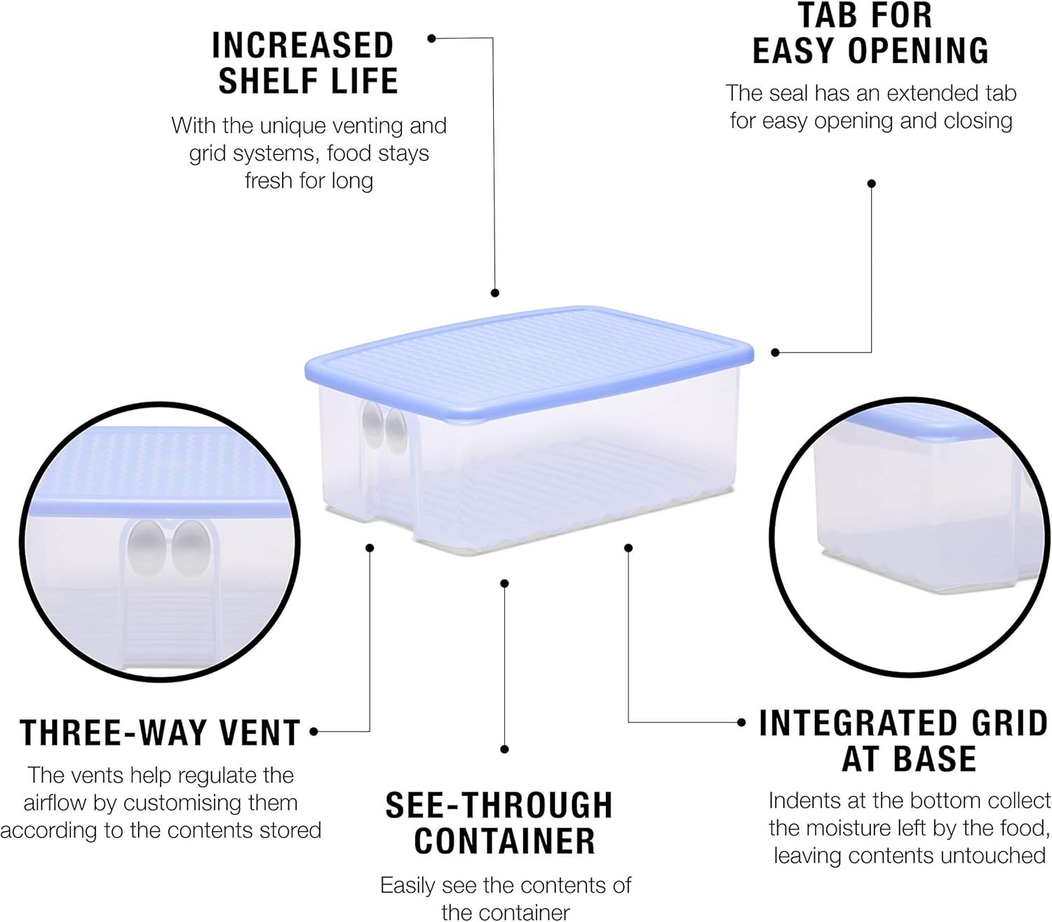 Uniform cooling: Ridges at the bottom allow for air circulation at the bottom too, thus cooling all the food items uniformally.