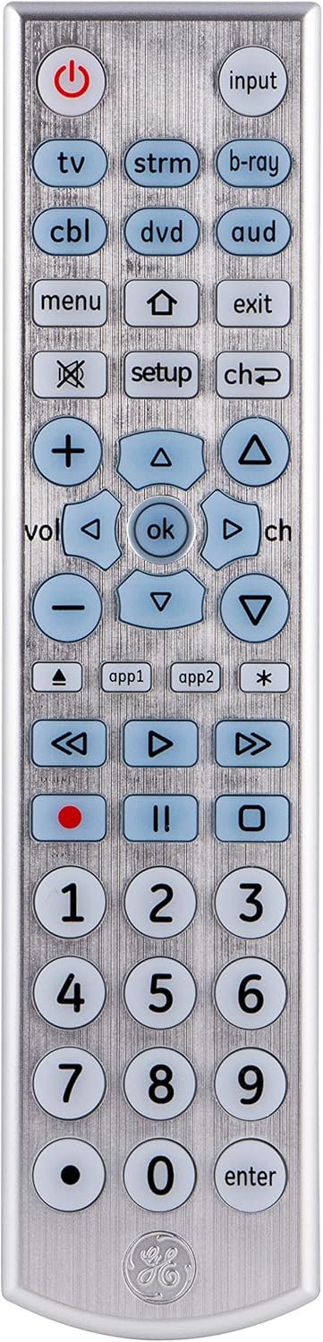 GE Big Button Backlit Universal Remote Control for Samsung, Vizio, Lg, Sony, Sharp, Roku, Apple TV, TCL, Panasonic, Smart TVs, Streaming Players, Blu-Ray, DVD, 6-Device, Silver, 33712