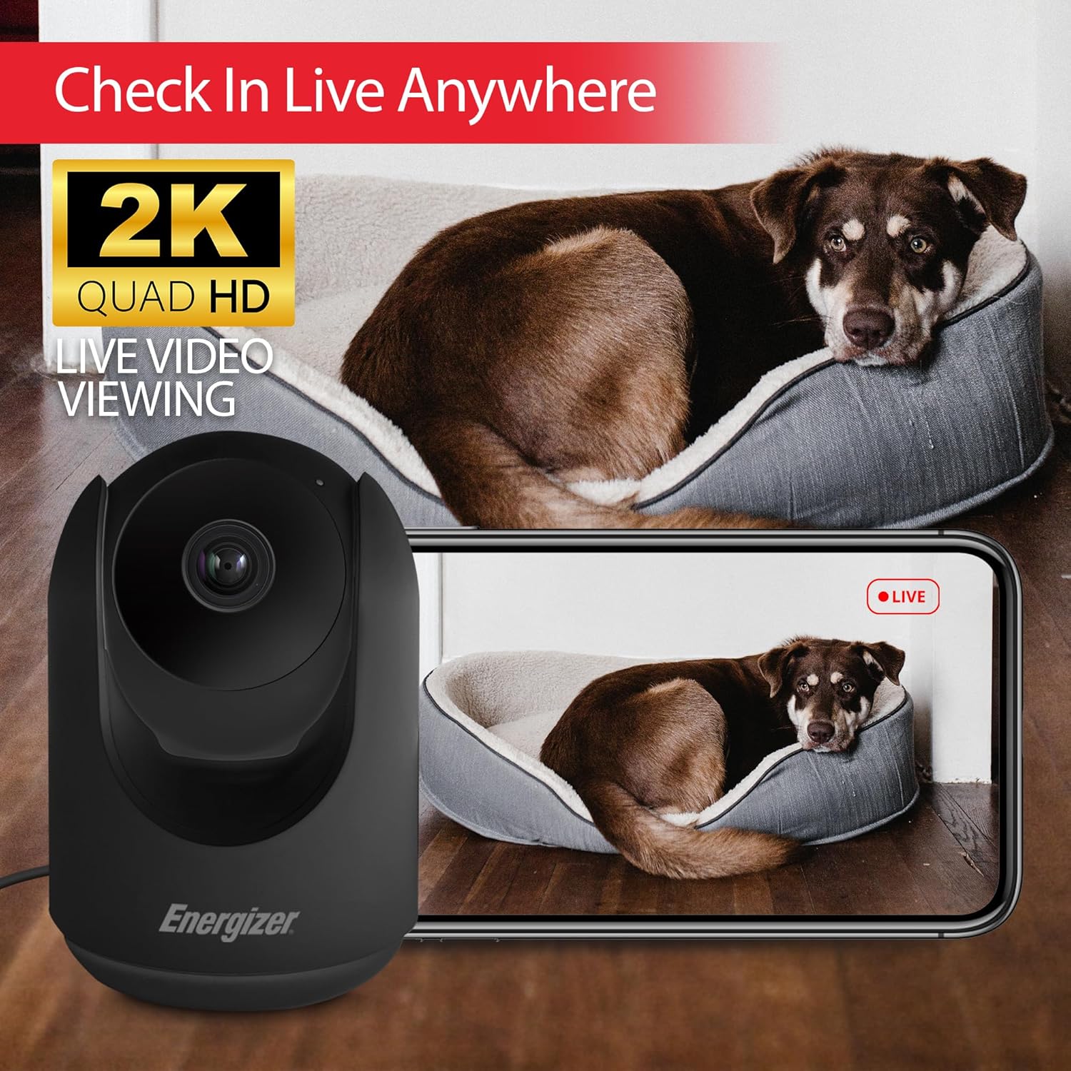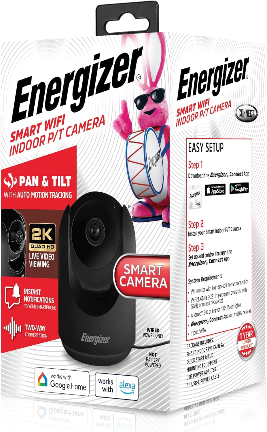 Energizer Smart 2K Indoor Pan & Tilt Wired Camera, Motion Tracking, Two-Way Audio, Night Vision, Instant Notifications, Recording, App, Hub-Free Wi-Fi Connection, Compatible with Alexa & Google Home