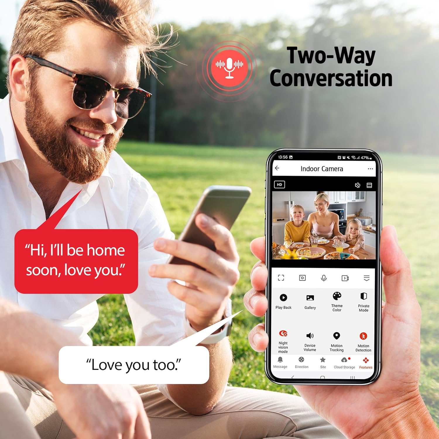 Two-Way Audio & Night Vision: Communicate directly with anyone in the room through the built-in two-way audio, making it easy to interact with family members or pets from afar. The enhanced night vision feature ensures visibility even in complete darkness, allowing for 24/7 monitoring without compromising on clarity.
