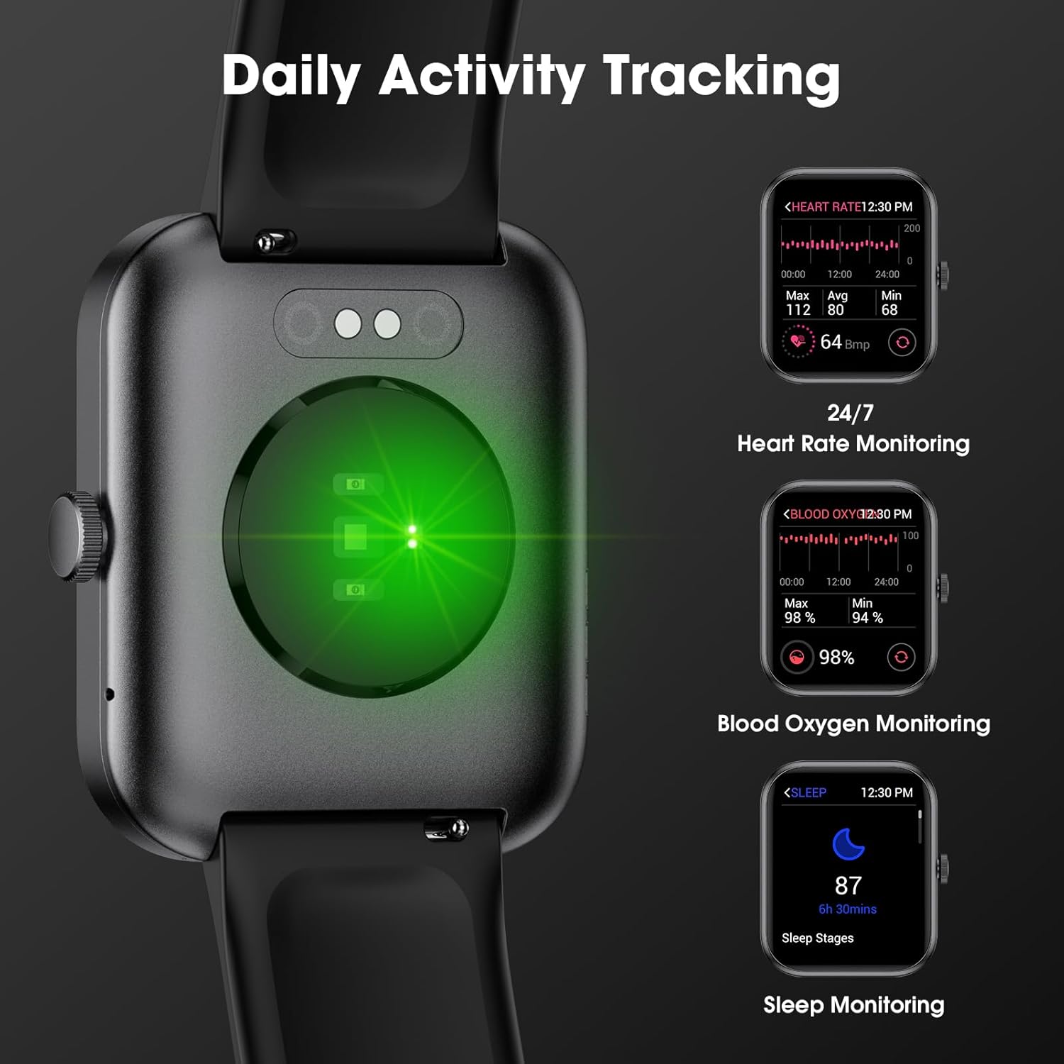 【24/7 Heart Rate Monitor & Sleep Tracker】Automatically monitor your real-time heart rate and your sleep (Deep sleep, Light sleep and Awake time)and analyze your sleep quality automatically. And it can provide blood-oxygen saturation measurement, stress levels & sleep tracking, as well as calories burned counter.